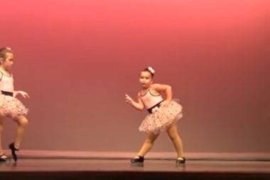 Tři mladí tanečnice ve růžových šatech předvádějí tanec na dětském koncertu. Ale holčička stojící uprostřed dokázala díky svému osobnímu…