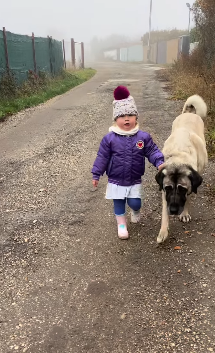 Malá Rija jde vedle chlupatého rodinného mazlíčka s takovou samozřejmostí, že působí jako jeho malá parťačka na zimních výpravách.