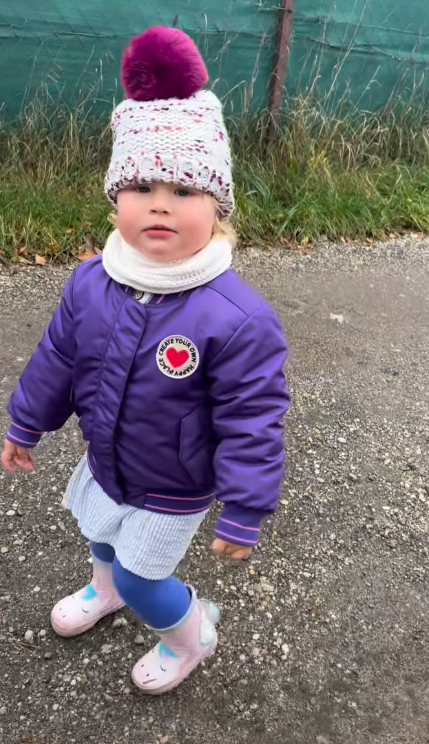 Batole mělo na sobě fialovou bomber bundičku a pletenou čepici s bambulí, které jí dodaly vzhled, jaký by bez váhání obstál i v katalogu dětské módy.