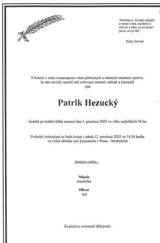 Rodina, přátelé i fanoušci se chystají na poslední rozloučení s Patrikem Hezuckým , moderátorem, který po desetiletí vstupoval do domácností s typickým humorem a nakažlivou energií.