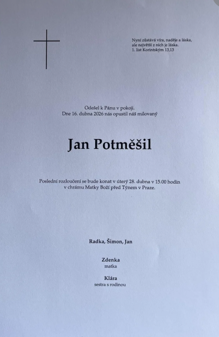 Smuteční oznámení působí velmi střídmě, ale o to silněji – jako by přesně vystihovalo hercovu osobnost i jeho životní příběh.